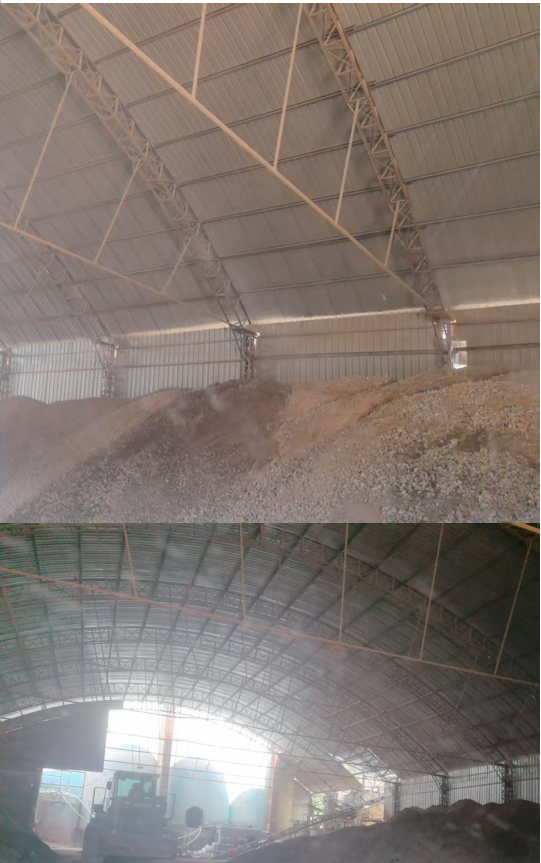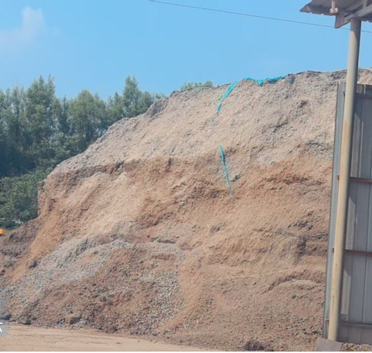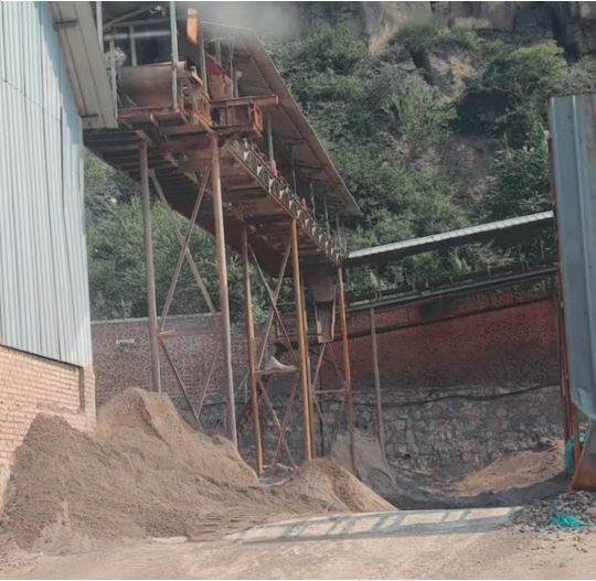 從照片中可以看到該黑石料場(chǎng)規(guī)模很大,場(chǎng)地堆放著很多砂石料。生產(chǎn)區(qū)域粉塵滿天飛,沒有采取噴淋灑水等防揚(yáng)塵環(huán)保設(shè)施,廠區(qū)周圍道路植被都已被粉塵污染鋪滿。