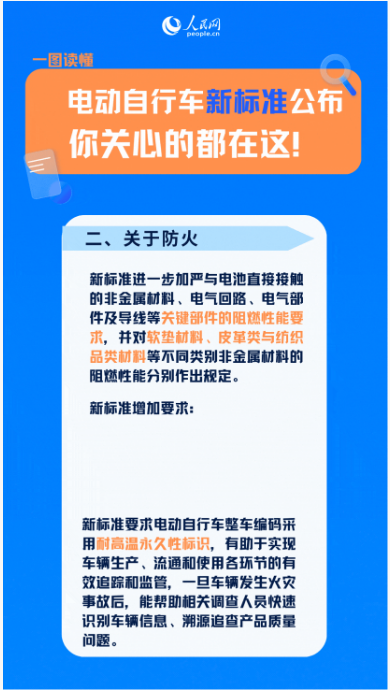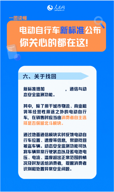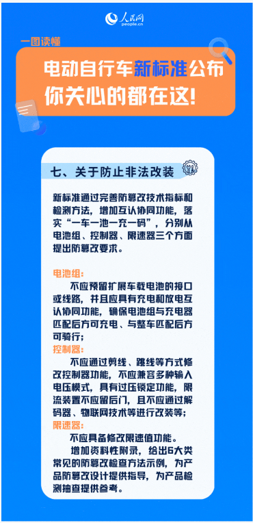 為防范“私自解速”現(xiàn)象的發(fā)生,9月起實(shí)施的電動(dòng)自行車“新國(guó)標(biāo)”明確,一旦超過25公里每小時(shí),電動(dòng)機(jī)自動(dòng)停止動(dòng)力輸出。此外,“新國(guó)標(biāo)”還完善了電動(dòng)自行車的電池組、控制器、限速器的防篡改要求,并增加北斗定位、通信與動(dòng)態(tài)安全監(jiān)測(cè)功能。