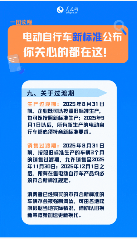 2025年9月1日以后,所有新生產(chǎn)的電動(dòng)自行車都必須符合新國(guó)標(biāo)要求。在銷售方面,新國(guó)標(biāo)則額外給予2025年8月31日及之前按照舊標(biāo)準(zhǔn)生產(chǎn)的車輛3個(gè)月的銷售過渡期,允許銷售至2025年11月30日;2025年12月1日之后,所有銷售的電動(dòng)自行車產(chǎn)品均必須符合新標(biāo)準(zhǔn)規(guī)定。