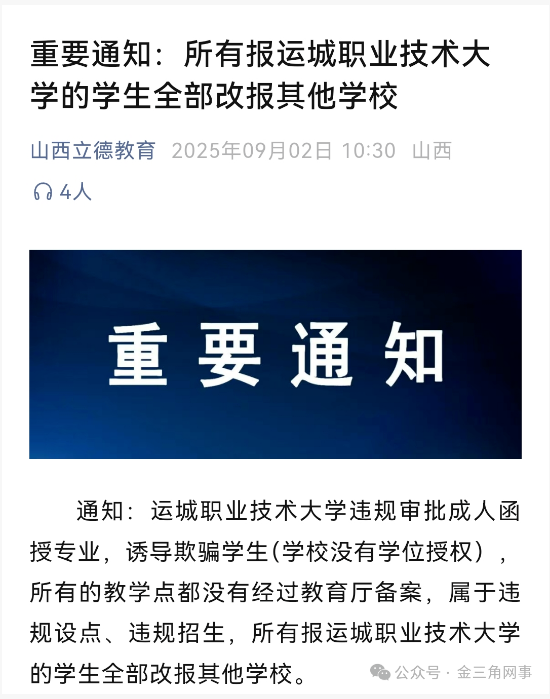 備案制度不是擺設(shè),它像防火墻,擋住的是野雞機構(gòu),保護的是學生學費和青春。運城職大卻繞開這道墻,用“大學”招牌吸走信任,再用“繼續(xù)教育”做擋箭牌。學生以為報的是正規(guī)軍,結(jié)果成了游擊隊。