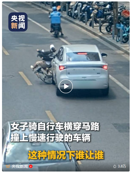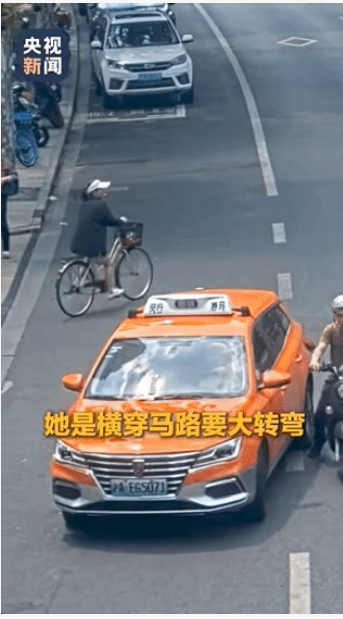 視頻顯示,一名女子騎自行車邊轉(zhuǎn)彎邊橫穿馬路,與一輛慢速行駛的車輛發(fā)生碰撞,女子倒地受傷。