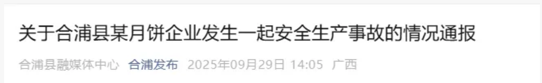 9月29日下午,廣西北海合浦縣發(fā)布某月餅企業(yè)發(fā)生一起安全生產(chǎn)事故的情況通報: