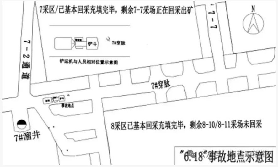 事故地點(diǎn)位于-205m分段7#穿脈,作業(yè)內(nèi)容為7-7采場(chǎng)鏟運(yùn)機(jī)出礦作業(yè),出礦溜井為7#穿7#溜井。-192m~-205m分段7-7采場(chǎng)位于II礦帶北部,采區(qū)各采場(chǎng)沿礦體走向布置,采場(chǎng)長(zhǎng)度38米,寬度10m。采場(chǎng)出礦采用WJ-2柴油鏟運(yùn)機(jī),鏟運(yùn)機(jī)由7-7采場(chǎng)進(jìn)行裝礦至7#穿脈內(nèi)7#溜井,由裝礦點(diǎn)裝入側(cè)翻式礦車內(nèi),再由電機(jī)車轉(zhuǎn)運(yùn)至中段主溜井。7-7采場(chǎng)出礦點(diǎn)距離7#溜井距離66m,事故地點(diǎn)距離溜井16m,7#穿脈全長(zhǎng)142m,實(shí)測(cè)斷面為(寬)3.4m×(高)3m。