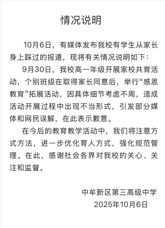 說明稱,9月30日,該校高一年級開展家校共育活動,個別班級在取得家長同意后,舉行“感恩教育”拓展活動,因具體細節(jié)考慮不周,造成活動開展過程中出現(xiàn)不當形式,引發(fā)部分媒體和網(wǎng)民誤解,在此表示歉意。