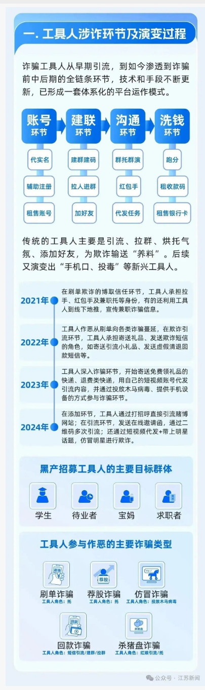 二、“工具人” 作案手法大揭秘,學會識別不上當要想避免淪為電詐 “工具人”,首先得了解他們的作案手法。從演變過程來看,“工具人” 作案手法不斷升級,作惡類型也愈發(fā)多樣。早期,不法分子主要通過短信、電話等方式招募 “工具人”,讓其幫忙進行簡單的信息傳遞。隨著監(jiān)管加強,他們開始轉(zhuǎn)戰(zhàn)社交平臺,利用微信、QQ 等添加陌生好友,編造 “錯加好友”“朋友推薦” 等話術(shù)獲取信任,再誘導對方參與 “兼職”。從作惡類型來看,常見的有以下幾種:一是 “引流型”,讓 “工具人” 添加目標用戶為好友,再將其拉進詐騙群,為詐騙分子引流;二是 “轉(zhuǎn)賬型”,以 “刷單返利”“代付” 等名義,讓 “工具人” 幫忙轉(zhuǎn)賬,轉(zhuǎn)移詐騙資金;三是 “推廣型”,讓 “工具人” 在朋友圈、群聊中發(fā)布虛假廣告、詐騙鏈接,誘導用戶點擊。想要識別這些套路其實并不難,記住這幾點:不輕信 “錯加好友” 等陌生話術(shù),不隨意添加陌生人為好友;不貪圖 “高薪兼職” 的誘惑,凡是不需要技能、輕松賺錢的兼職,大概率是騙局;不下載來路不明的 APP,不隨意點擊陌生鏈接,保護好個人信息和財產(chǎn)安全。
