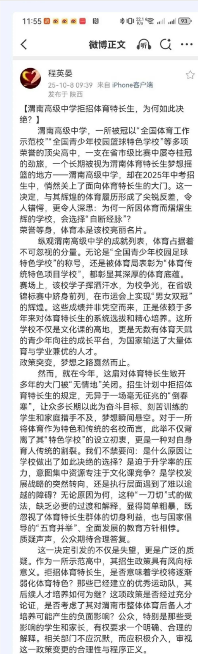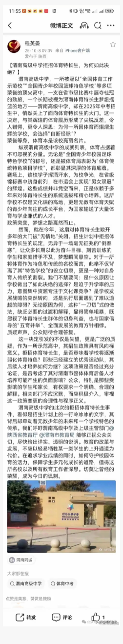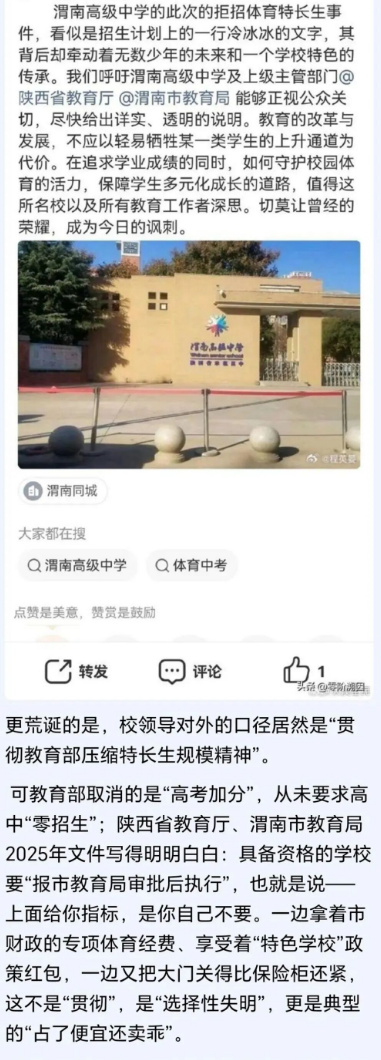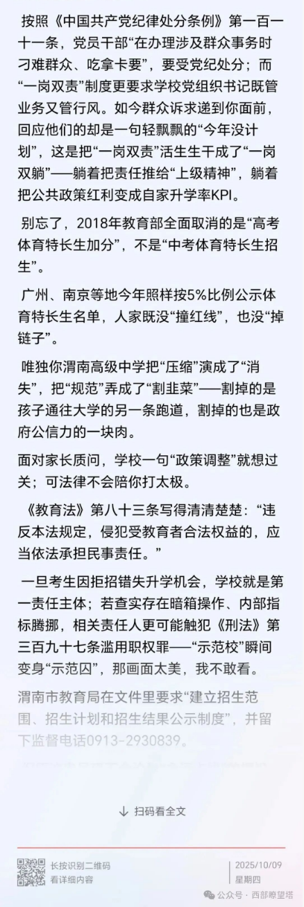 可教育部取消的是“高考加分”,從未要求高中“零招生”;陜西省教育廳、渭南市教育局2025年文件寫得明明白白:具備資格的學校要“報市教育局審批后執(zhí)行”,也就是說——上面給你指標,是你自己不要。一邊拿著市財政的專項體育經(jīng)費、享受著“特色學校”政策紅包,一邊又把大門關(guān)得比保險柜還緊,這不是“貫徹”,是“選擇性失明”,更是典型的“占了便宜還賣乖”。按照《中國共產(chǎn)黨紀律處分條例》第一百一十一條,黨員干部“在辦理涉及群眾事務(wù)時刁難群眾、吃拿卡要”,要受黨紀處分;而“一崗雙責”制度更要求學校黨組織書記既管業(yè)務(wù)又管行風。如今群眾訴求遞到你面前,回應(yīng)他們的卻是一句輕飄飄的“今年沒計劃”,這是把“一崗雙責”活生生干成了“一崗雙躺”——躺著把責任推給“上級精神”,躺著把公共政策紅利變成自家升學率KPI。別忘了,2018年教育部全面取消的是“高考體育特長生加分”,不是“中考體育特長生招生”。廣州、南京等地今年照樣按5%比例公示體育特長生名單,人家既沒“撞紅線”,也沒“掉鏈子”。唯獨你渭南高級中學把“壓縮”演成了“消失”,把“規(guī)范”弄成了“割韭菜”——割掉的是孩子通往大學的另一條跑道,割掉的也是政府公信力的一塊肉。