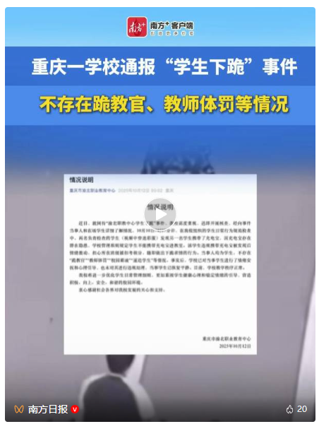 近日,就網(wǎng)傳“渝北職教中心學(xué)生下跪”事件,該校高度重視,迅即開展核查,經(jīng)向事件當(dāng)事人和在場學(xué)生詳細了解情況,10月10日7時27分許,在該校組織的學(xué)生日常行為規(guī)范檢查中,兩名負(fù)責(zé)檢查的學(xué)生(視頻中穿迷彩服)發(fā)現(xiàn)另一名學(xué)生攜帶了充電寶,因充電寶存在潛在隱患,學(xué)校管理準(zhǔn)則規(guī)定學(xué)生不能攜帶充電寶進教室。該學(xué)生違規(guī)攜帶充電寶被發(fā)現(xiàn)后情緒激動,擔(dān)心所在班級被扣考核分,隨即做出下跪求情的行為。當(dāng)事人均為學(xué)生,不存在“跪教官”“教師體罰”“校園霸凌”“逼迫學(xué)生”等情況。事發(fā)后,學(xué)校已對當(dāng)事學(xué)生進行了情緒安撫和心理引導(dǎo),也未對其進行違規(guī)處理,當(dāng)事學(xué)生已恢復(fù)平靜。目前,學(xué)校教學(xué)秩序正常。