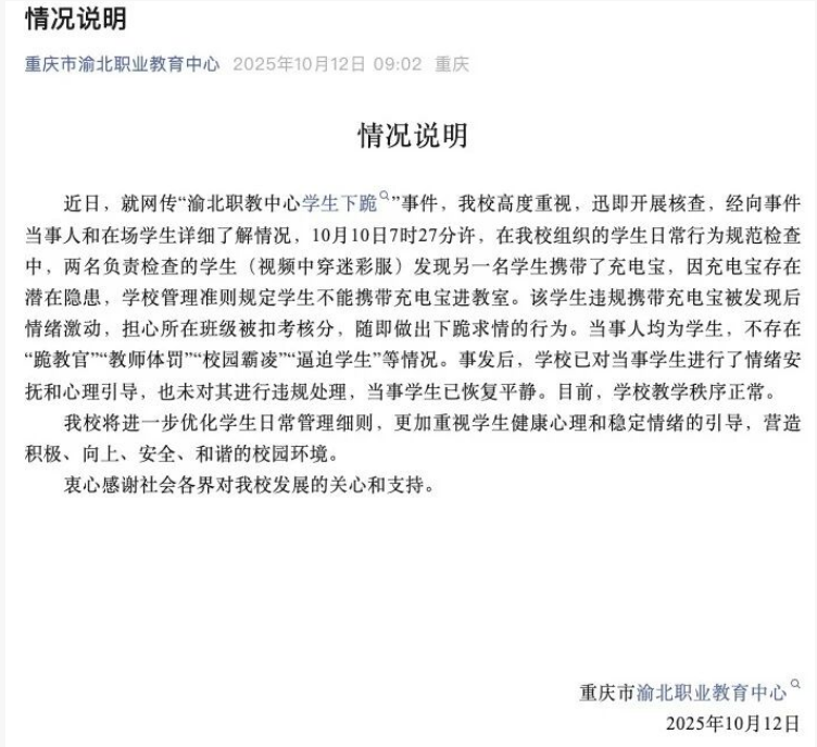 10月12日,重慶市渝北職業(yè)教育中心就網(wǎng)傳“渝北職教中心學(xué)生下跪”事件發(fā)布情況說明: