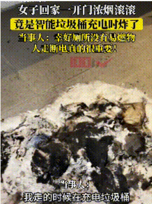2023年11月,四川成都一女子家中智能垃圾桶充電時炸裂,造成濃煙。