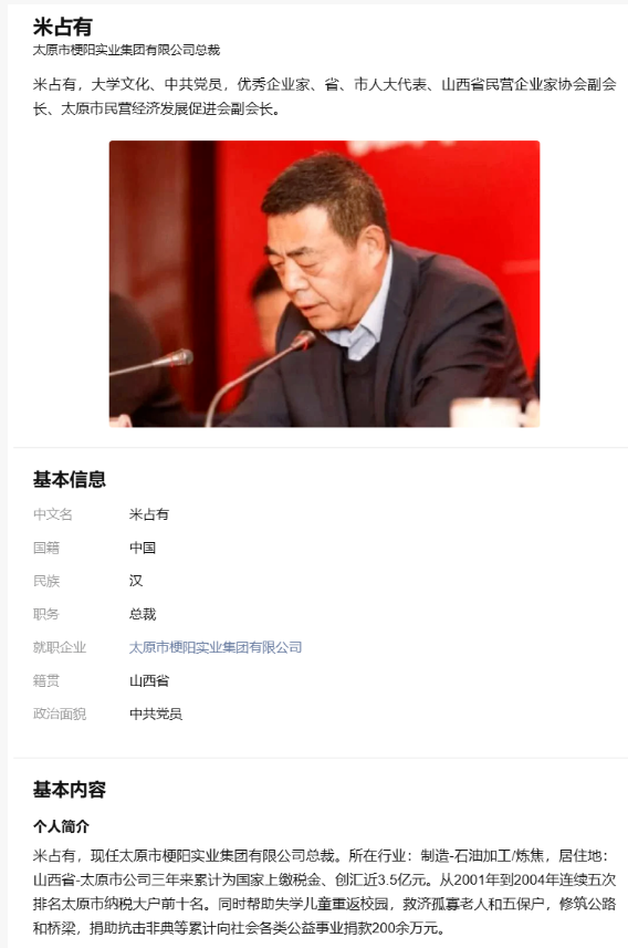 米占有,現(xiàn)任太原市梗陽(yáng)實(shí)業(yè)集團(tuán)有限公司總裁。所在行業(yè):制造-石油加工/煉焦,居住地:山西省-太原市公司三年來(lái)累計(jì)為國(guó)家上繳稅金、創(chuàng)匯近3.5億元。從2001年到2004年連續(xù)五次排名太原市納稅大戶(hù)前十名。同時(shí)幫助失學(xué)兒童重返校園,救濟(jì)孤寡老人和五保戶(hù),修筑公路和橋梁,捐助抗擊非典等累計(jì)向社會(huì)各類(lèi)公益事業(yè)捐款200余萬(wàn)元。