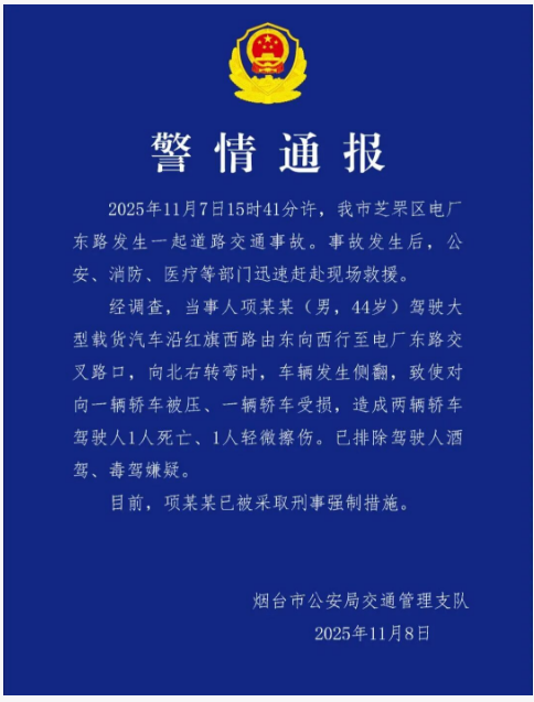 11月7日,山東省煙臺市芝罘區(qū)道路上發(fā)生一起車禍,一輛大型載貨汽車在十字路口轉(zhuǎn)彎時車輛側(cè)翻,整個車身壓在一輛轎車上,轎車直接被掩埋,事故造成車上駕駛員死亡。事發(fā)后,公安、消防、醫(yī)療等部門趕到現(xiàn)場救援。11月8日,煙臺交警通報,貨車司機項某某已被采取刑事強制措施。