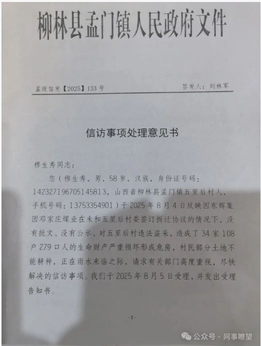 面對村民的訴求,孟門鎮(zhèn)政府于2025年10月27日出具了《信訪事項處理意見書》(孟政信發(fā)【2025】133號)。根據該意見書顯示,2023年11月,因鄧家莊煤業(yè)采掘部署調整,五里后村需實施整村搬遷,當時近100%村民同意搬遷,但在得知具體賠償標準后,村民們普遍提出異議;此后,鄧家莊煤業(yè)變更采掘方案獲相關部門批準,整村搬遷工作隨之陷入停滯。