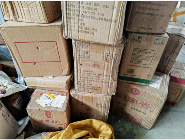 與周周有著密切合作的唐韻云倉,設(shè)立在山西太原市小店區(qū)。在云倉地堆及貨架上,陳列有大量的仿制做舊的老酒。工作人員表示,售后倉還有不少(消費者)退回來的老酒,近期售后倉(湖濱倉)那邊剛被查獲一批“實心郎”酒。在售后倉也堆放著劍南春、宜賓特曲、熊貓酒等假老酒,這也印證了上述說法。